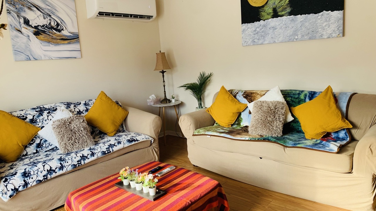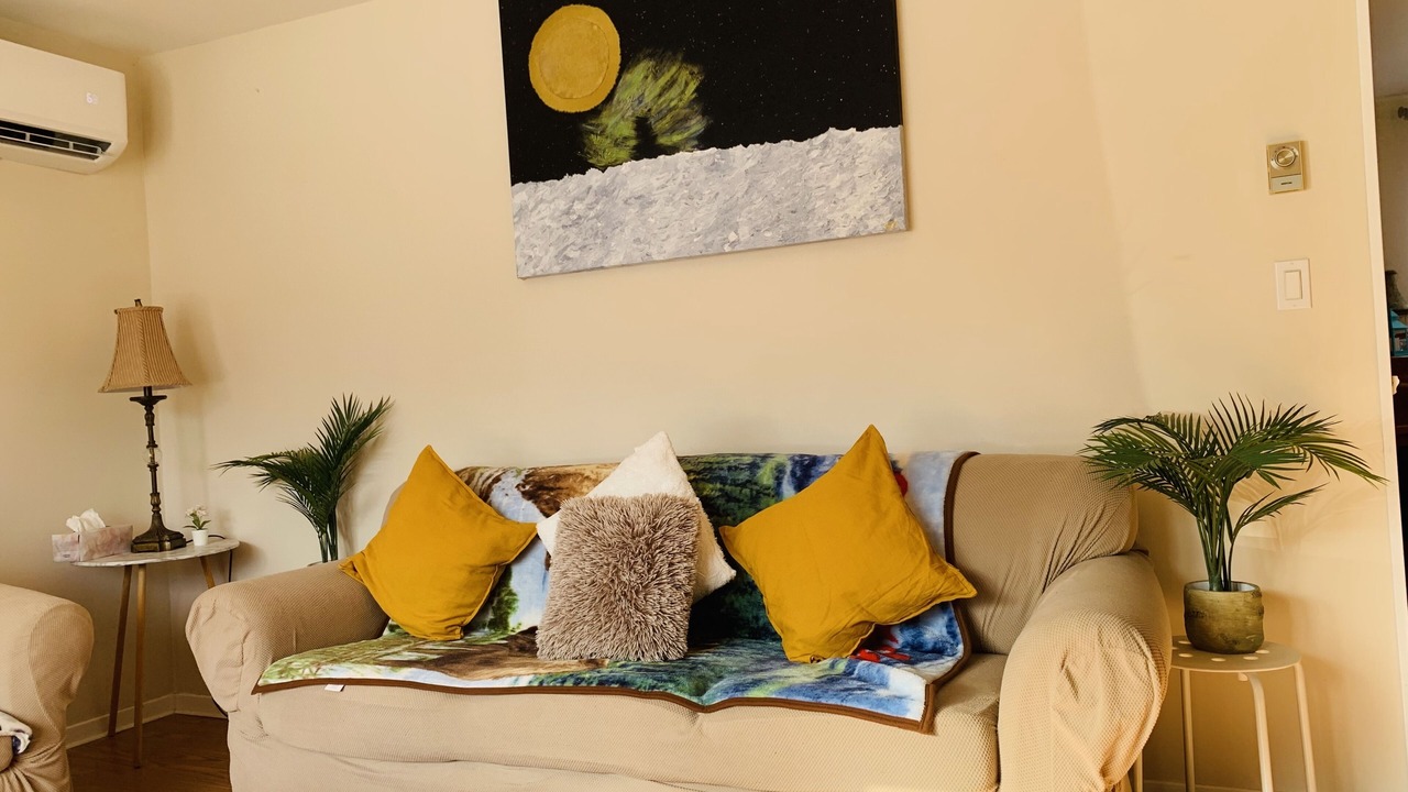 The main floor of a duplex unit with its own front yard, driveway, Patio, and PARKING for 2 cars. Self-check-in Smart Lock and doorbell camera for guest safety.