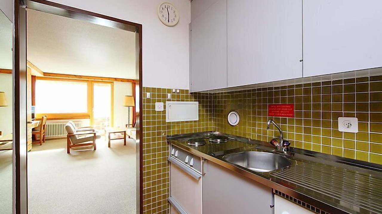 1-room apartment 38 m2 on 5th floor. Comfortable and rustic furnishings: living/dining room with 2 fold-away beds and cable TV (flat screen), radio. Exit to the balcony. Kitchenette (2 hot plates, oven). Shower/WC. Balcony 7 m2, south facing position. Beautiful view of the mountains, the countryside and the resort. Facilities: Internet (WiFi, free). Parking. Please note: non-smokers only.
