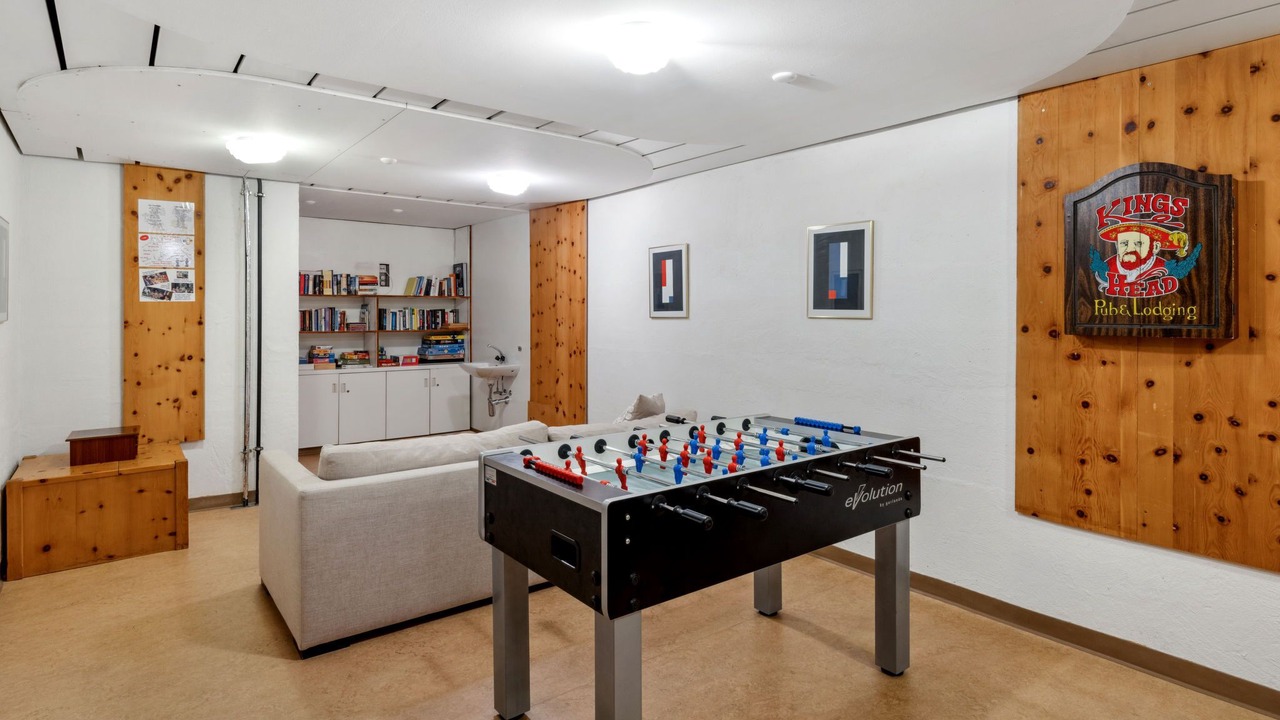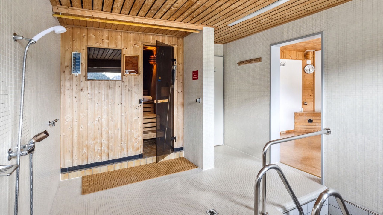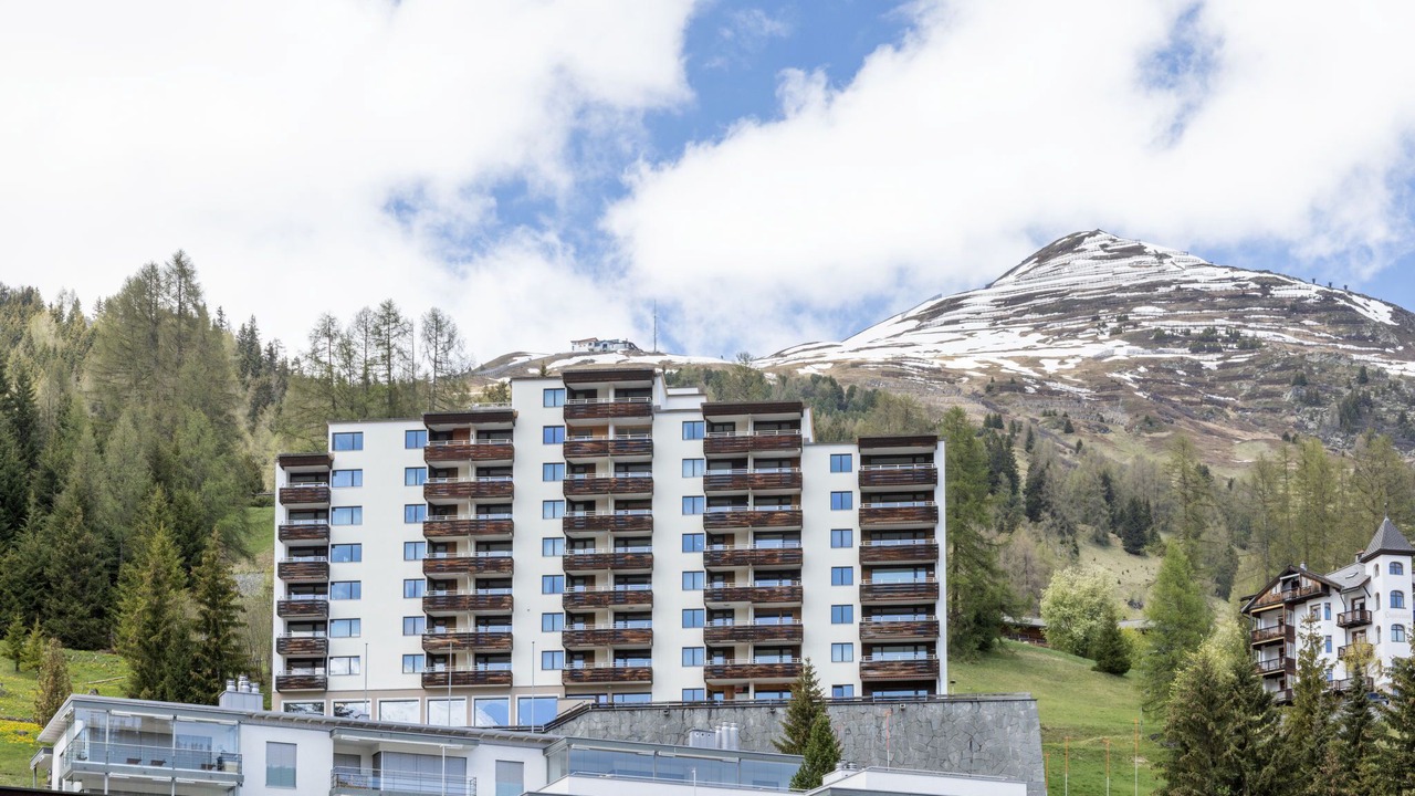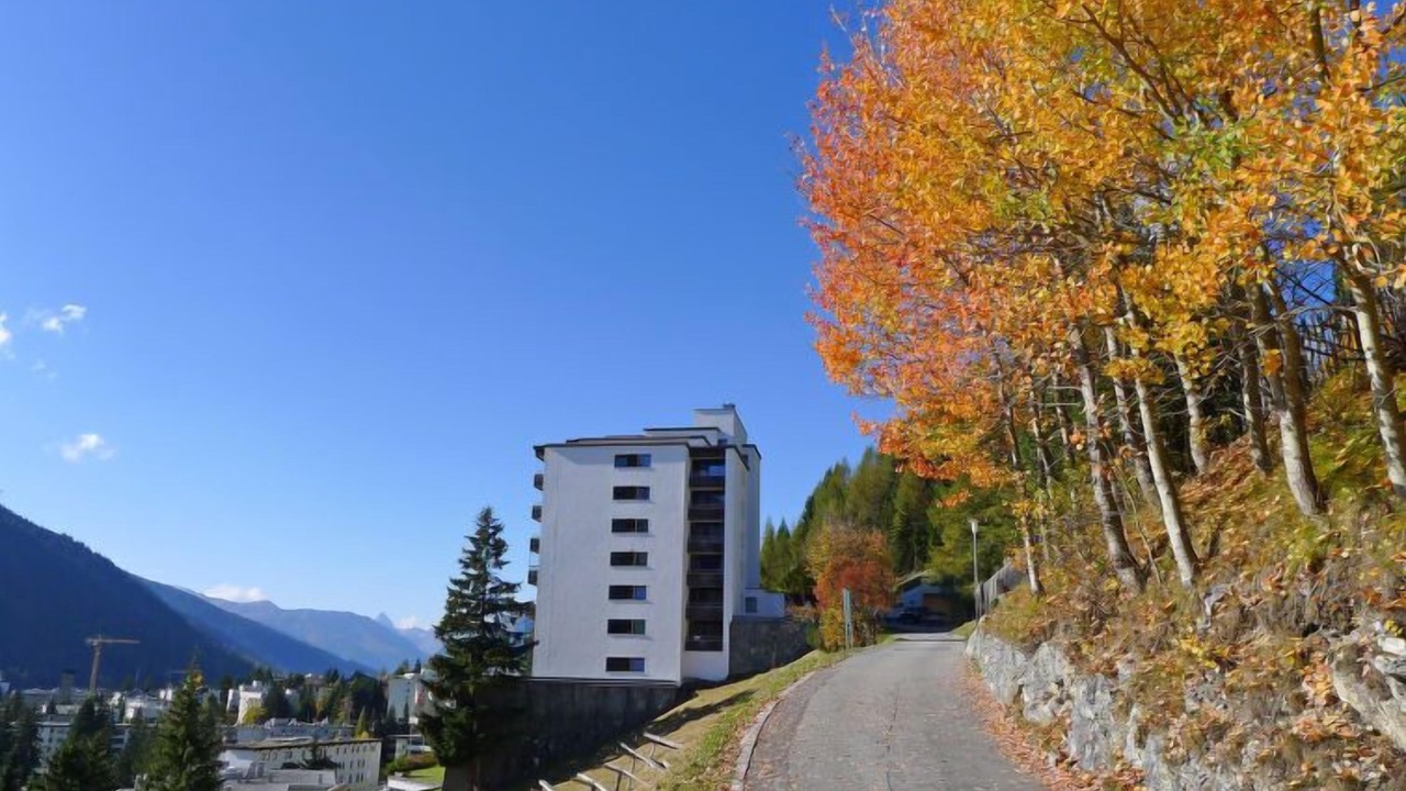 Davos: Apartment block "Guardaval (Utoring)". In the resort, in a central, quiet, sunny position on a slope, 1 km from the lake, 300 m from the skiing area. For shared use: indoor pool. In the house: reception, lounge with TV, WiFi, sauna (extra). Playroom, lift, storage room for skis, central heating system, washing machine (for shared use). Bread roll service and beverage service. Narrow motor access to the house. Roofed, parking (limited number of spaces, extra), communal covered parking (extra). Shop 300 m, restaurant 300 m, bus stop, railway station "Davos Dorf" 400 m, indoor swimming pool 1 km, bathing lake 1 km. Mountain railway, skisport facilities, slopes, ski school, sled run 1.5 km, cross country ski track, ice rink 300 m. Well-known ski regions can easily be reached: Parsenn 300 m, Jakobshorn 1.5 km. The building is located upstream of the resort of Parsenn mountain and offers beautiful view. Parking + garage (reservation on arrival).