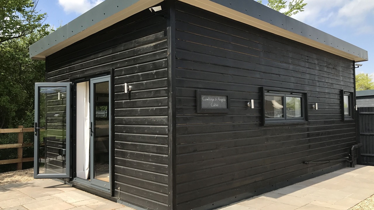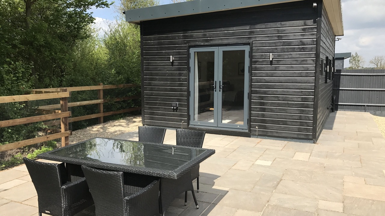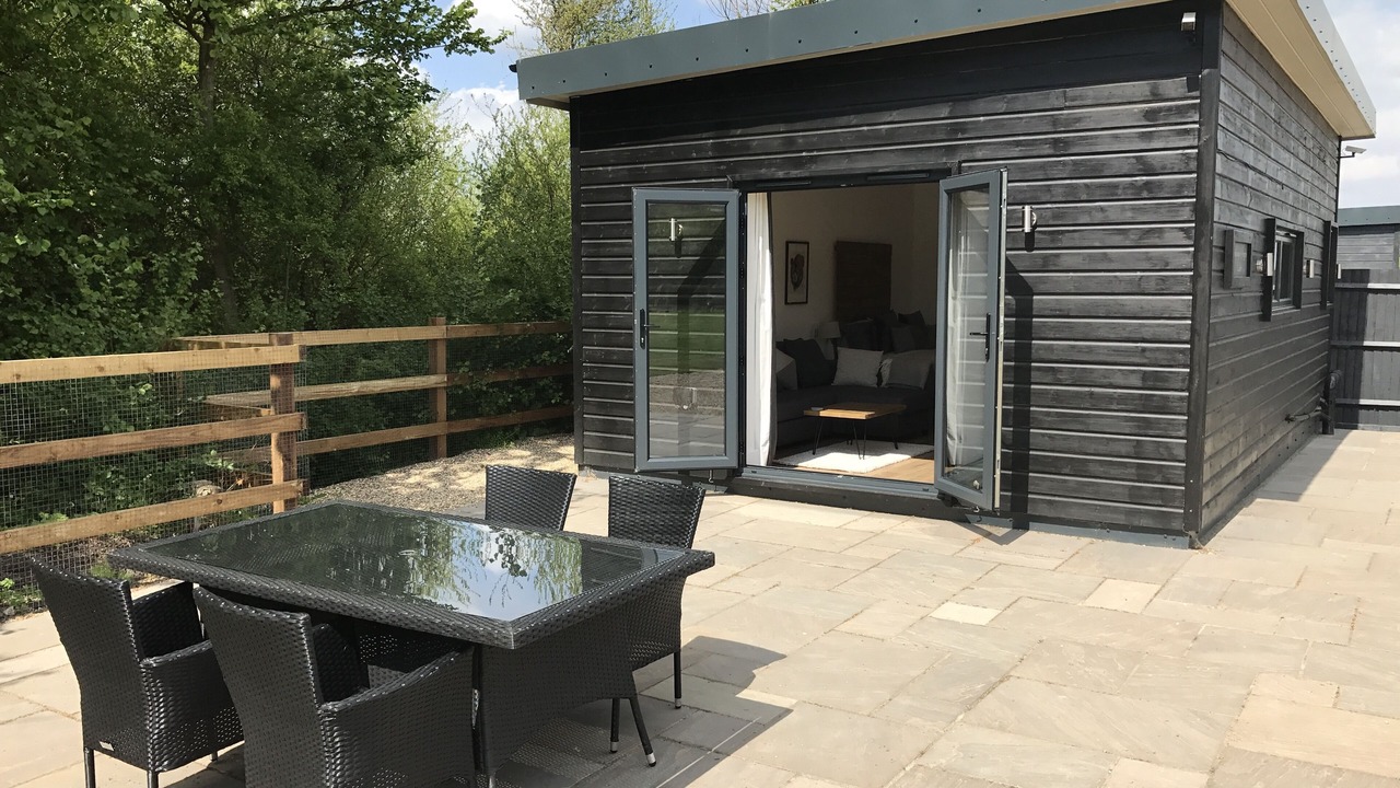 The cabin has been lovingly furnished with attention to detail. It’s bright and airy with high ceilings, is approx. 30 square meters in size and has double patio doors opening onto the garden and a breakfast bar area for inside dining.