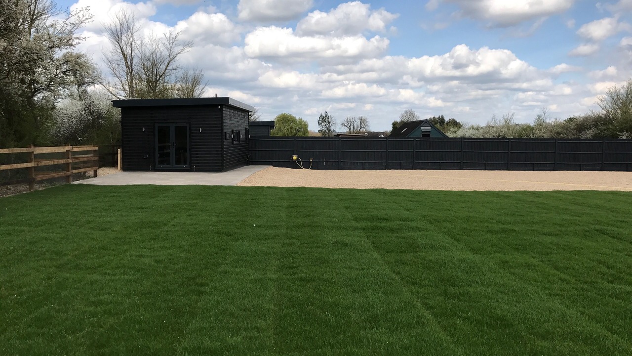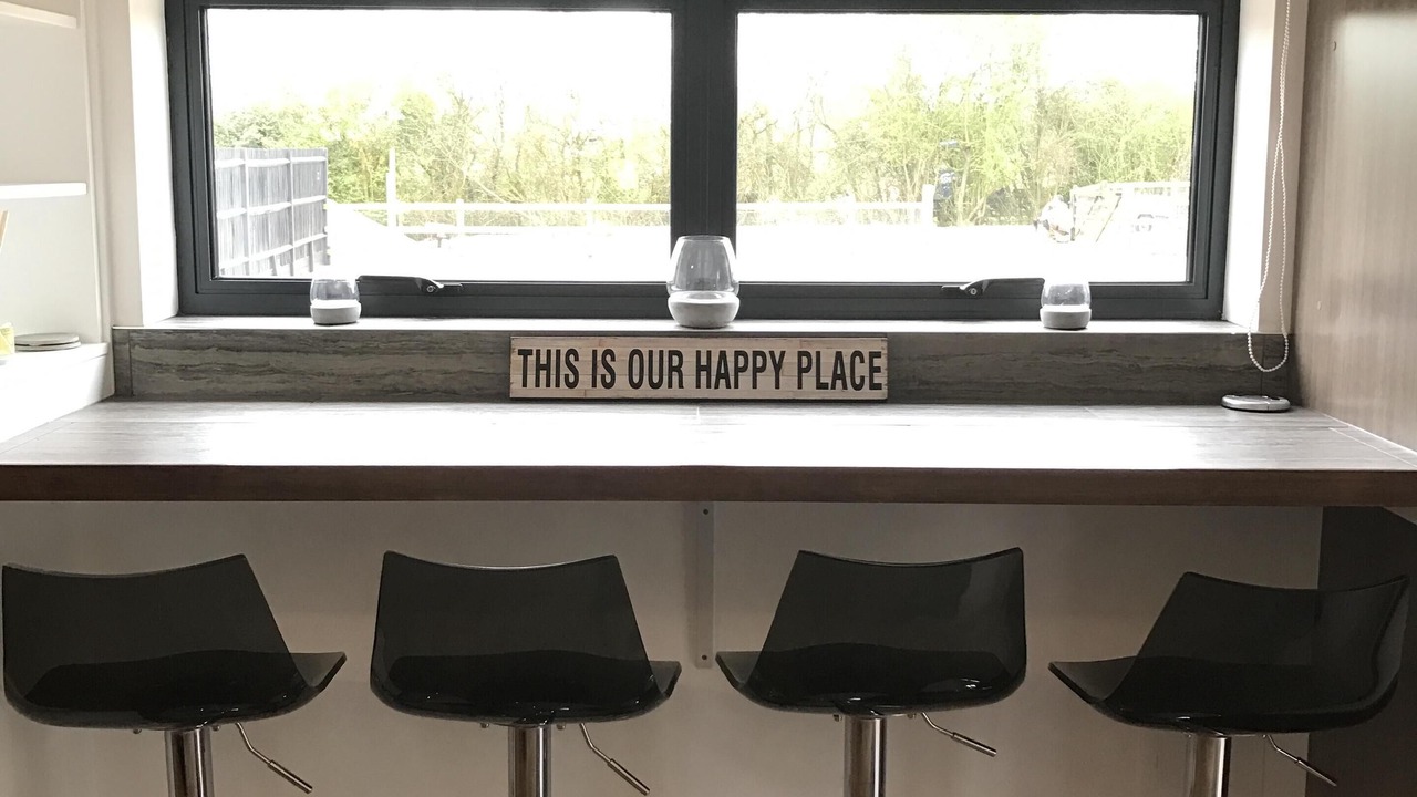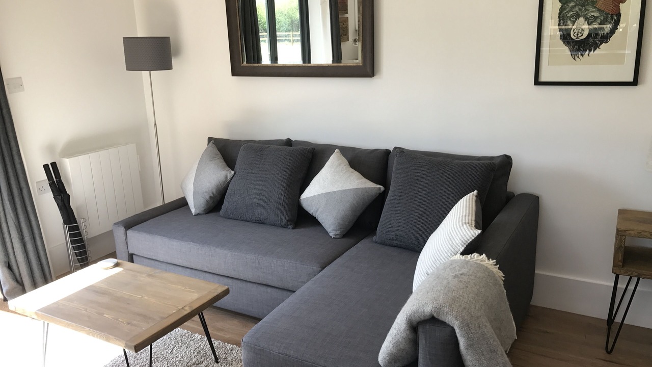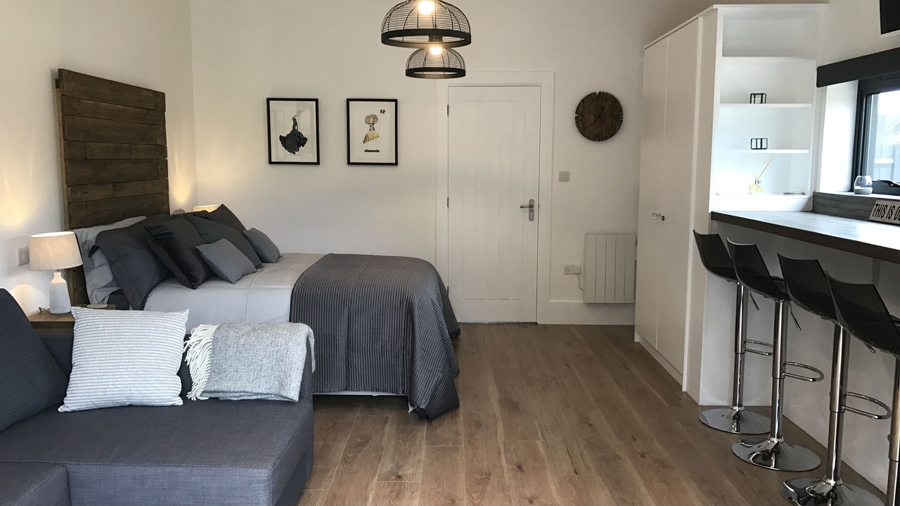 The cabin has been lovingly furnished with attention to detail. It’s bright and airy with high ceilings, is approx. 30 square meters in size and has double patio doors opening onto the garden and a breakfast bar area for inside dining.