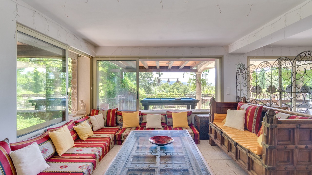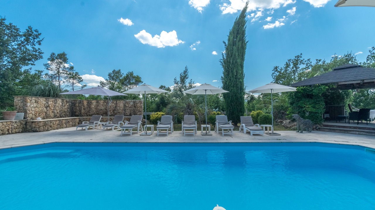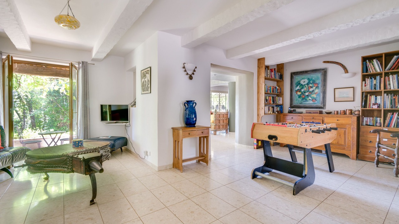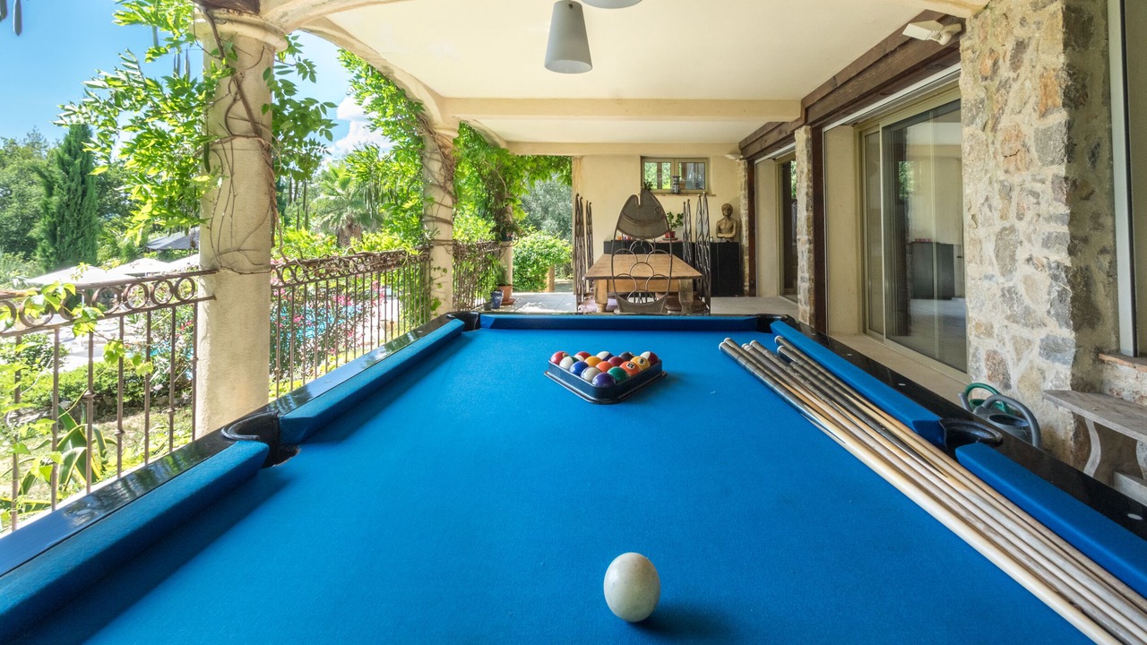 Located in a quiet and completely private location on the edge of a charming village half an hour from Cannes and other coastal towns such as Saint Raphael and Mandelieu, with Saint Tropez 45 min away. This very spacious, luxurious villa, is extremely well equipped including home cinema, satellite television and for the sporty a slate bed pool/billiard table, table tennis table, football table, a boules court as well as a well equipped exercise room including the latest spinning bike. The beautiful 11 x 4m heated swimming pool is the key freature of the property and set in one acre of gardens in a completely secluded location with stunning views. Overlooking this pool is also the gas barbecue and table seating 12 on the terrace. Internally there is a pond housing some very large Koi carp and numerous seating areas externally and internally to relax and enjoy your holiday. Wifi (fibre optic) connection throughout as well as English and French tv, 100's of DVD in the home cinema (tv) upstairs. Perfect for one or two or even three or more families to relax together and perfectly located to enjoy the beaches, forest and lakes close by as well as charming provencial villages with good restaurants and markets.