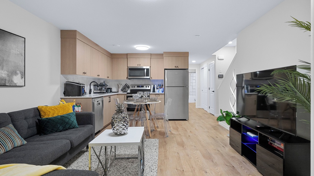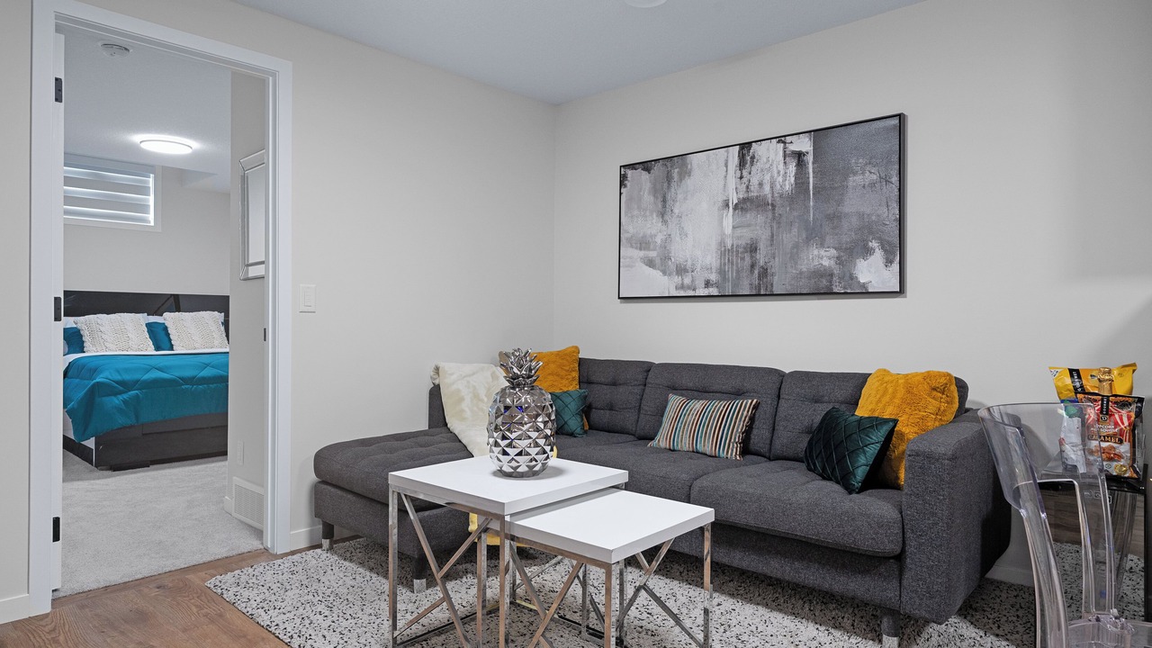This cozy, modern 2BR suite is in NW Calgary. It features include private entry, central A/C, 55" Smart TV, full kitchen with wine fridge, slow cooker, toaster, coffee machine, ice machine, and in-suite laundry.