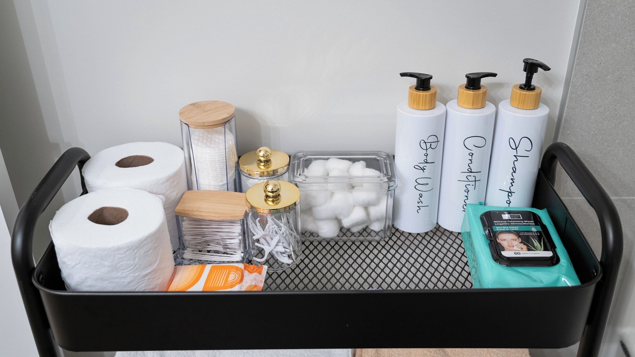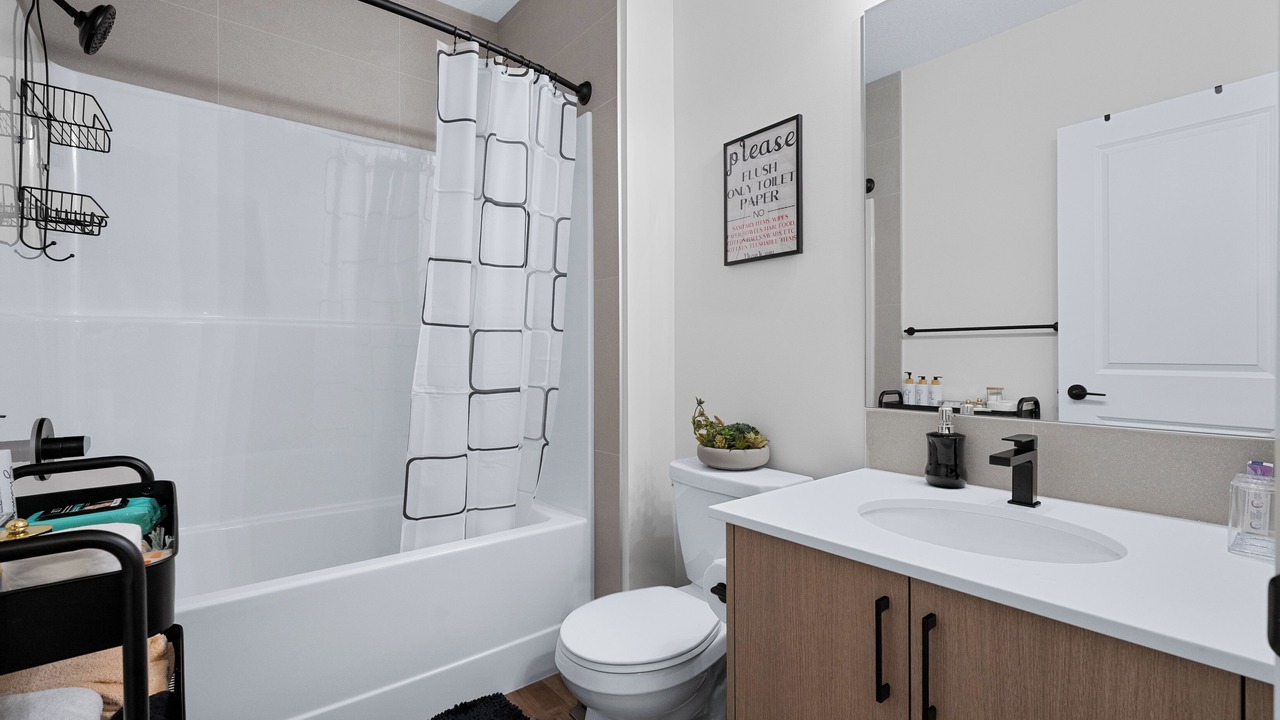 The bathroom is stocked with a tub/shower combo, along with essentials like shampoo, conditioner, body wash, toothpaste, and emergency sanitary items.