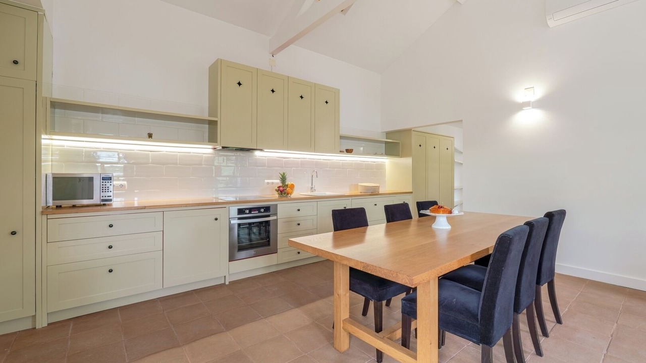 Follow the cobbled drive to find two handsome three-bedroom homes and a cosy two-bedroom cottage, each with its own kitchen and living room. Inside, vaulted ceilings, a double-sided fireplace and picture-window lounge invite fireside chats, while bright studies offer quiet desks for writing or Zoom calls. Eight serene bedrooms—five with full-size beds, three with twins—are paired with seven sparkling bathrooms, ensuring comfort and privacy for every guest.