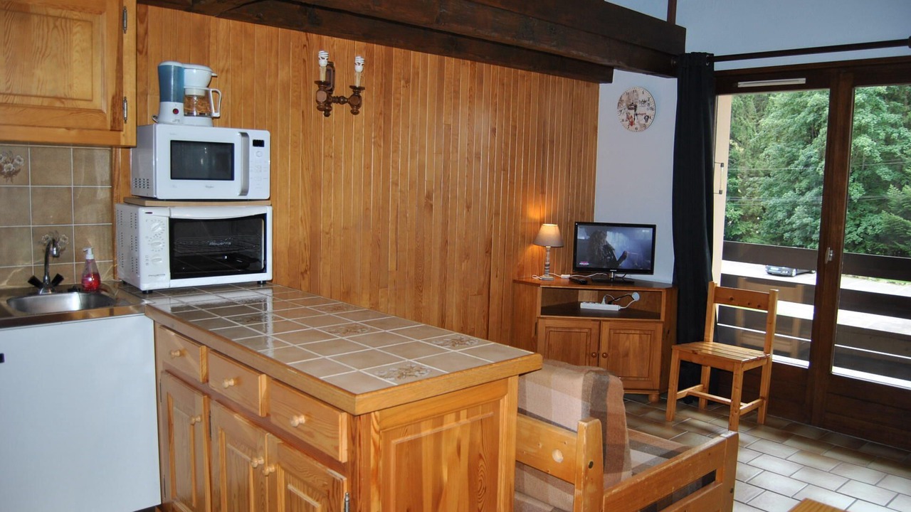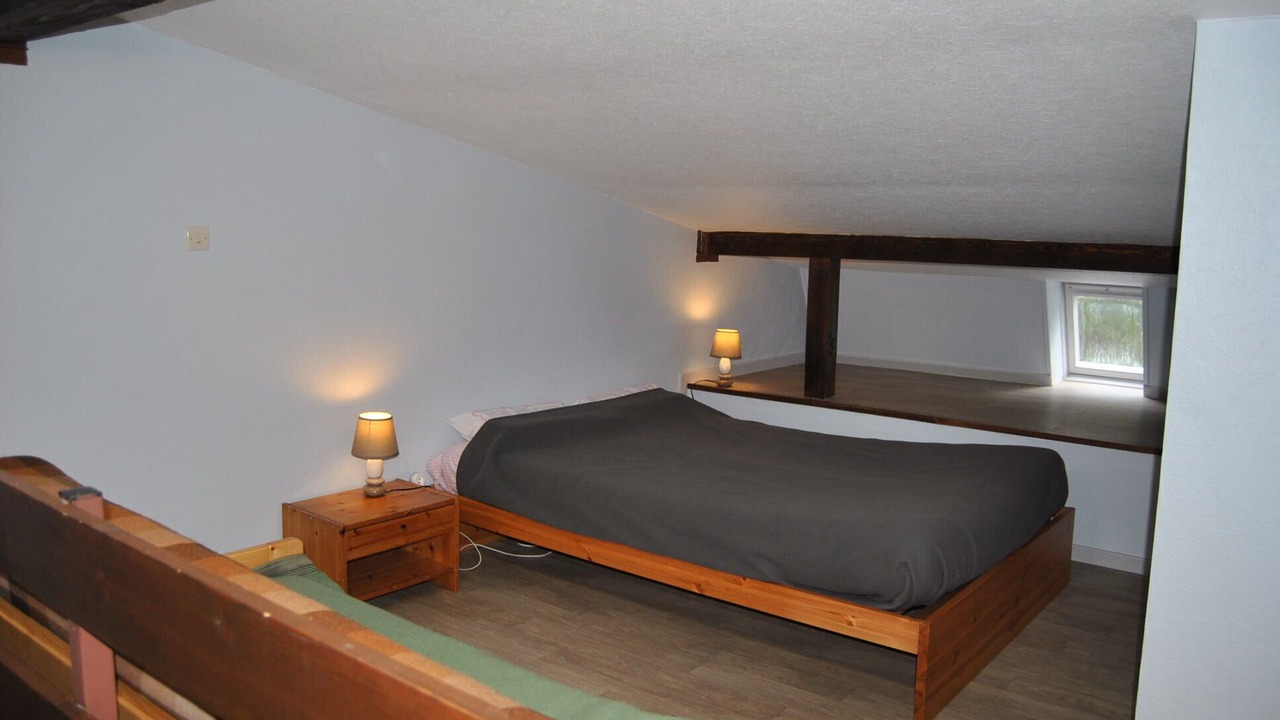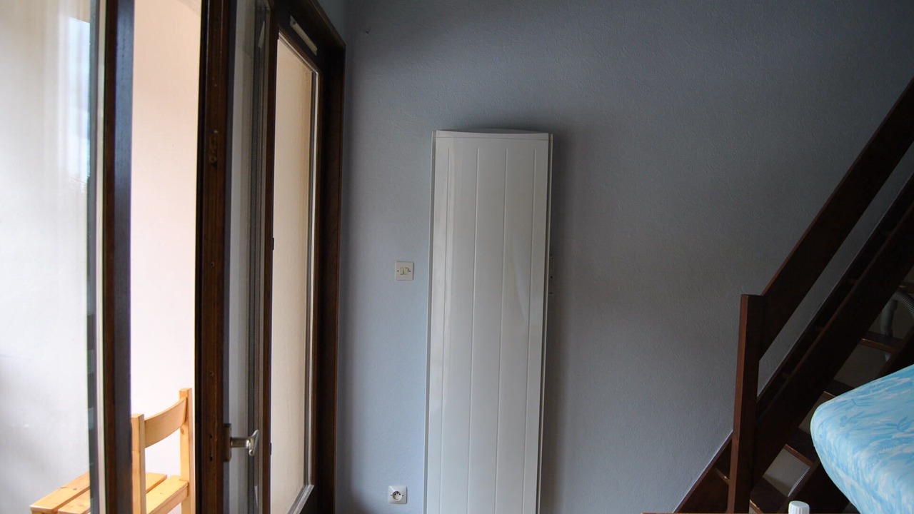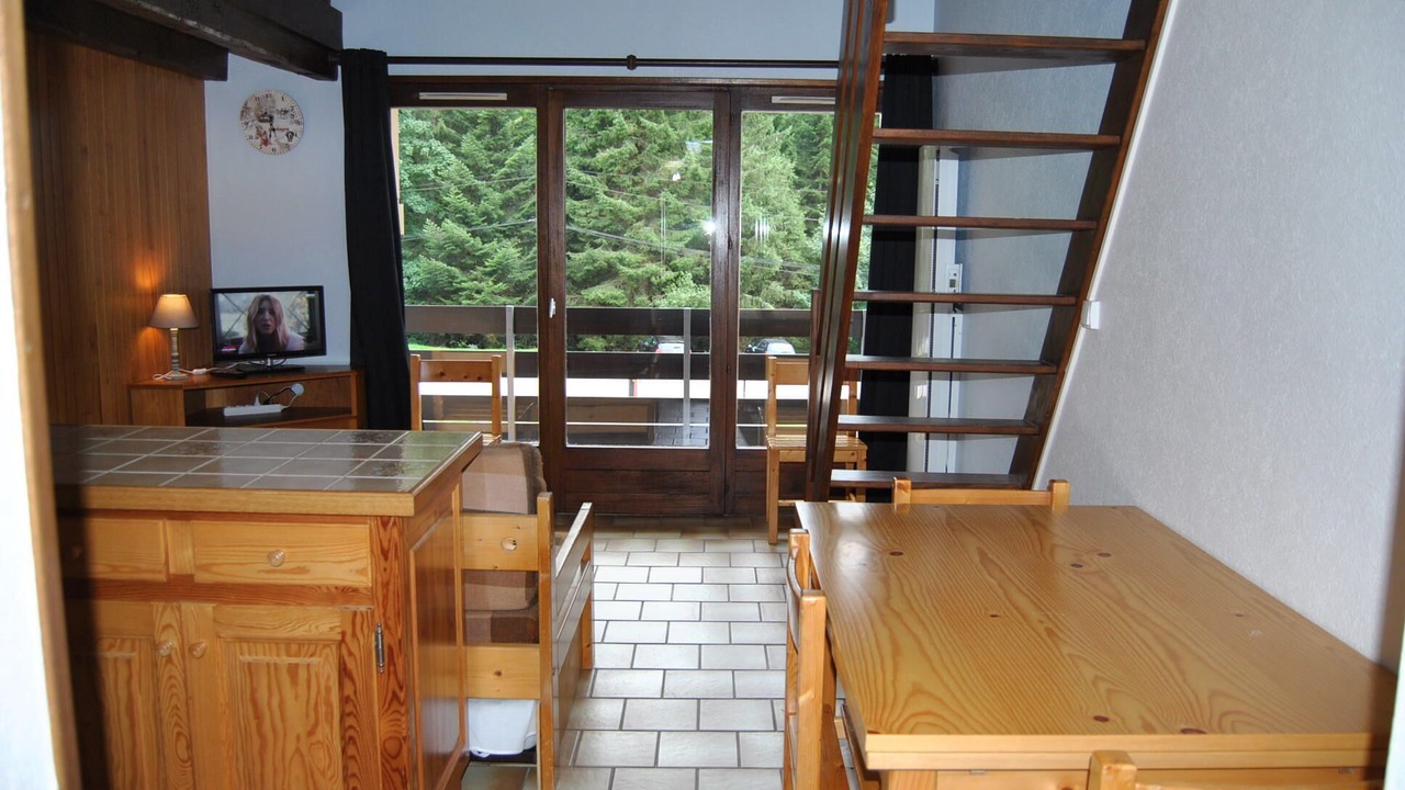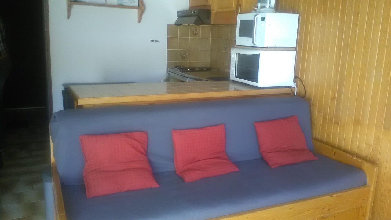 South exposure, view of the 40m² duplex slopes side in a quiet building with a covered entrance, consisting of an entrance hall with dressing room and storage, kitchen room: Table and chairs, fridge, oven, hob, microwave, meat grill ( croque-monsieur), vacuum cleaner. Living room with sofa bed (2 pers), flat screen TV, DVD player, playstation, board games, bathroom / wc (bathtub) hairdryer, balcony, garden table and chairs, Mezzanine (1 double bed + 1 bed simple), storage spaces.