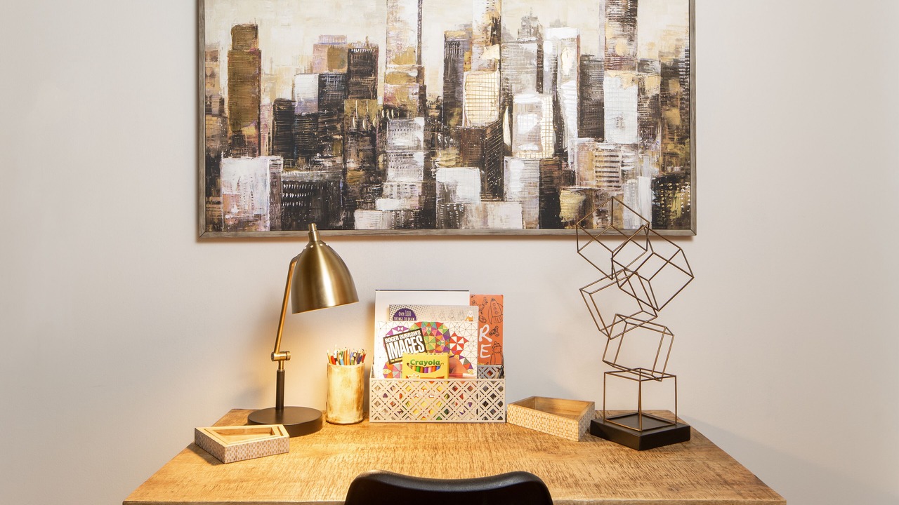 - Master Suite: king size bed, seating area with desk, and en suite bath