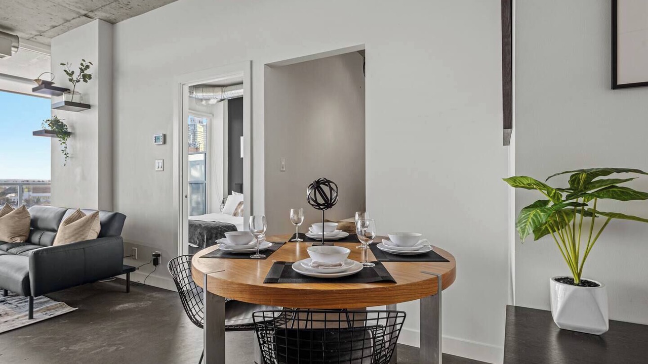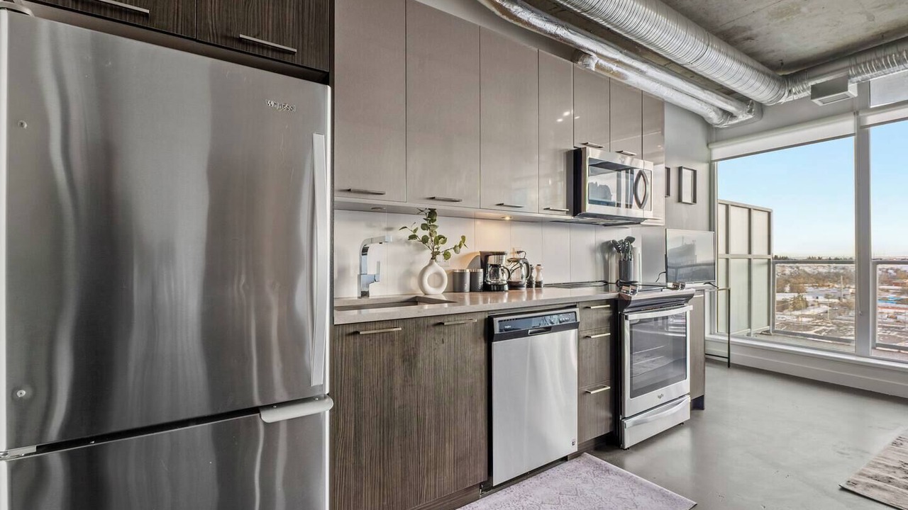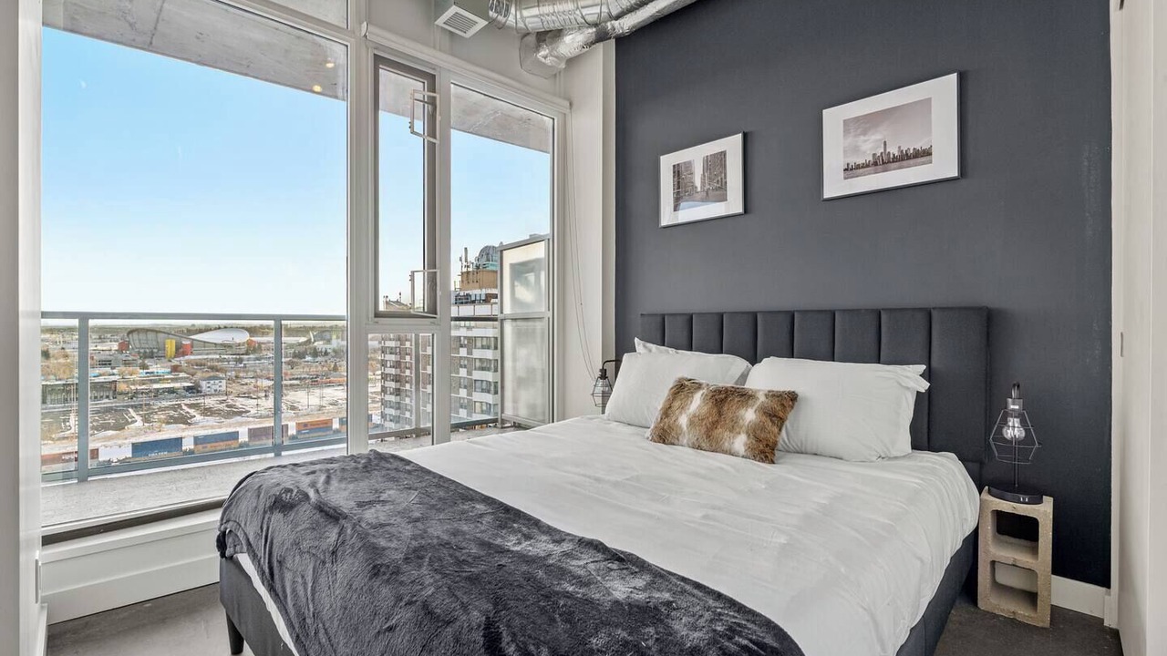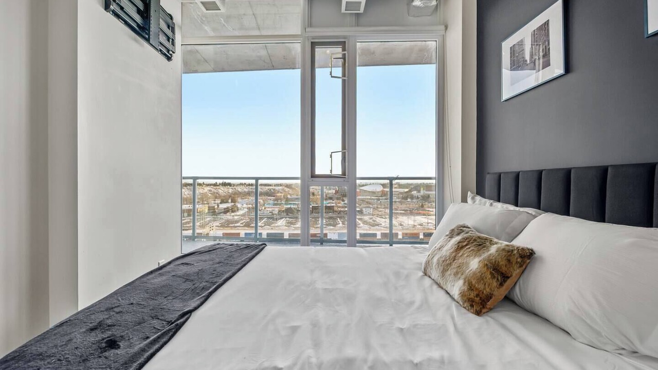 Welcome to the Brixton! After a long day of enjoying what Calgary has to offer, come home and unwind in our industrial style apartment. Enjoy the sunset from the large balcony or watch the downtown skyline at night. This unit was designed with our guests comfort in mind. High quality towels and linens, bathroom essentials and kitchen essentials will make your stay with us truly one of a kind. Please note second bedroom is a den area and is open. Please note this unit is located in a residential condo building. Although this will rarely happen, the condo building may experience periods of repair or maintenance in which there is a potential for water disruption, fire alarm inspection or furnace filter change. In the event this will happen, we will give as much notice as possible and will also provide water needed for your stay. Thank you for your understanding
