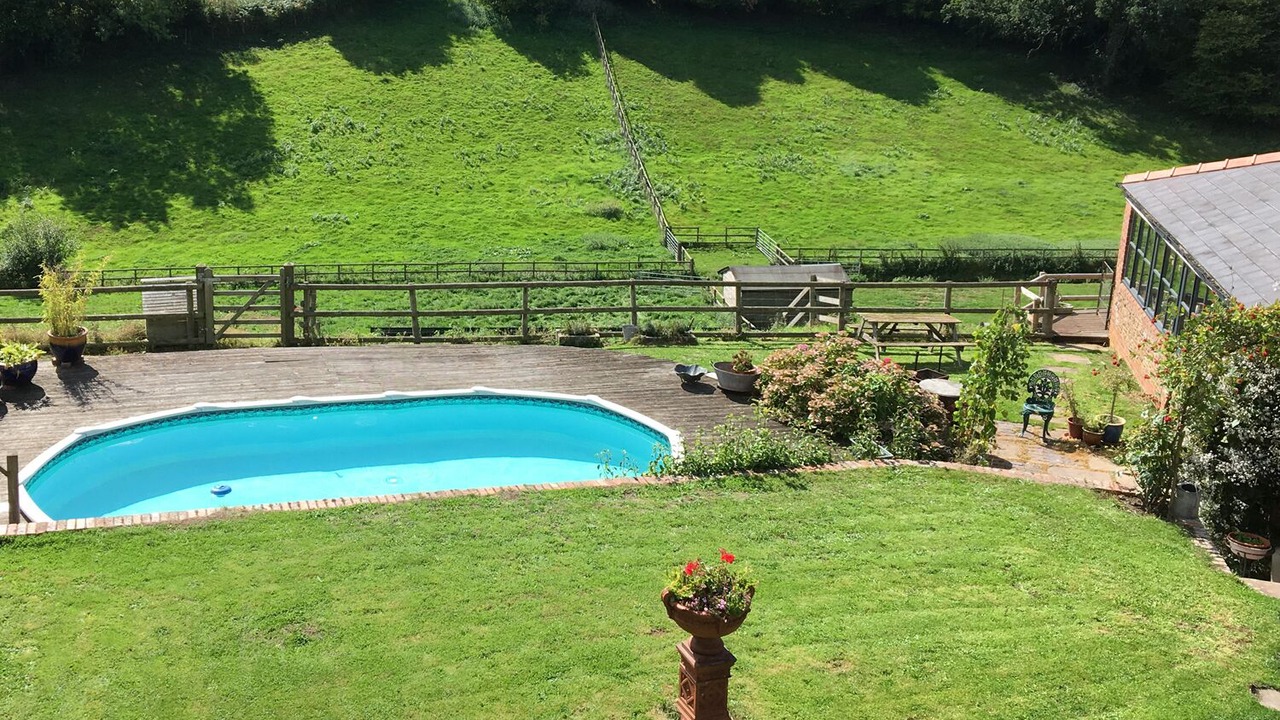 Amenities: Electric central heating with woodburning stove. Gas oven and hob, microwave, fridge, dishwasher. TV with Freeview, WiFi, selection of books, games and DVDs. Fuel and power inc. in rent. All supplies for woodburner available at all times free of charge. Bed linen and towels inc. in rent. Off-road parking. Orchard to the rear with bench. Shared non-heated outdoor swimming pool. Two well behaved dogs welcome. Sorry, no smoking. Shop 1 mile, and pub 5 mins walk. Note: Nine steps up to lawned area, then further steps up to the cottage entrance, not suitable for the elderly or those with limited mobility. Note: Access by narrow lane. Note: Shared swimming pool available dependent on the weather during summer months only.