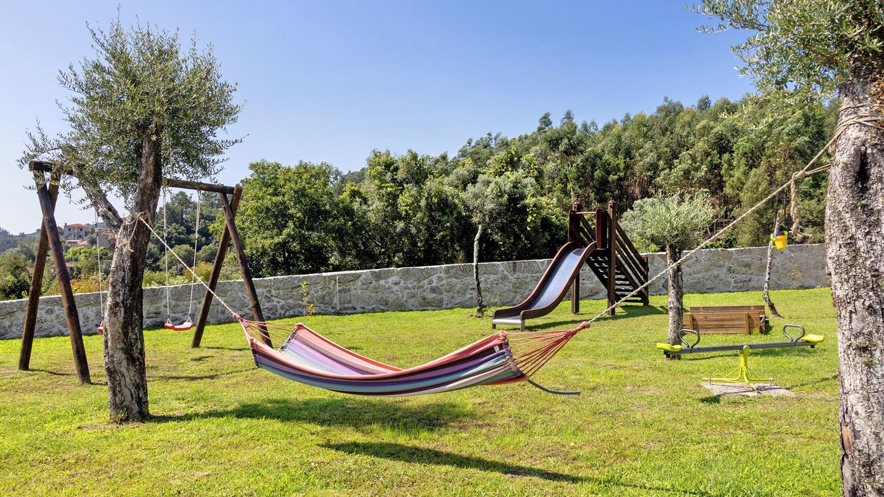 With a beautiful view of the lake, the country house Casa T1 is located in Vieira do Minho. The 30 m² property consists of a living room with a sofa bed for one person, a kitchen, 1 bedroom, and 1 bathroom, and can therefore accommodate 3 people. Additional amenities include high-speed Wi-Fi (suitable for video calls), a smart TV with streaming services, and air conditioning. Furthermore, a shared gym, fitness equipment, and a shared sauna are available on the property. A high chair is also provided. This vacation rental boasts a private outdoor area with a hot tub, garden, terrace, barbecue, playground, and outdoor shower.