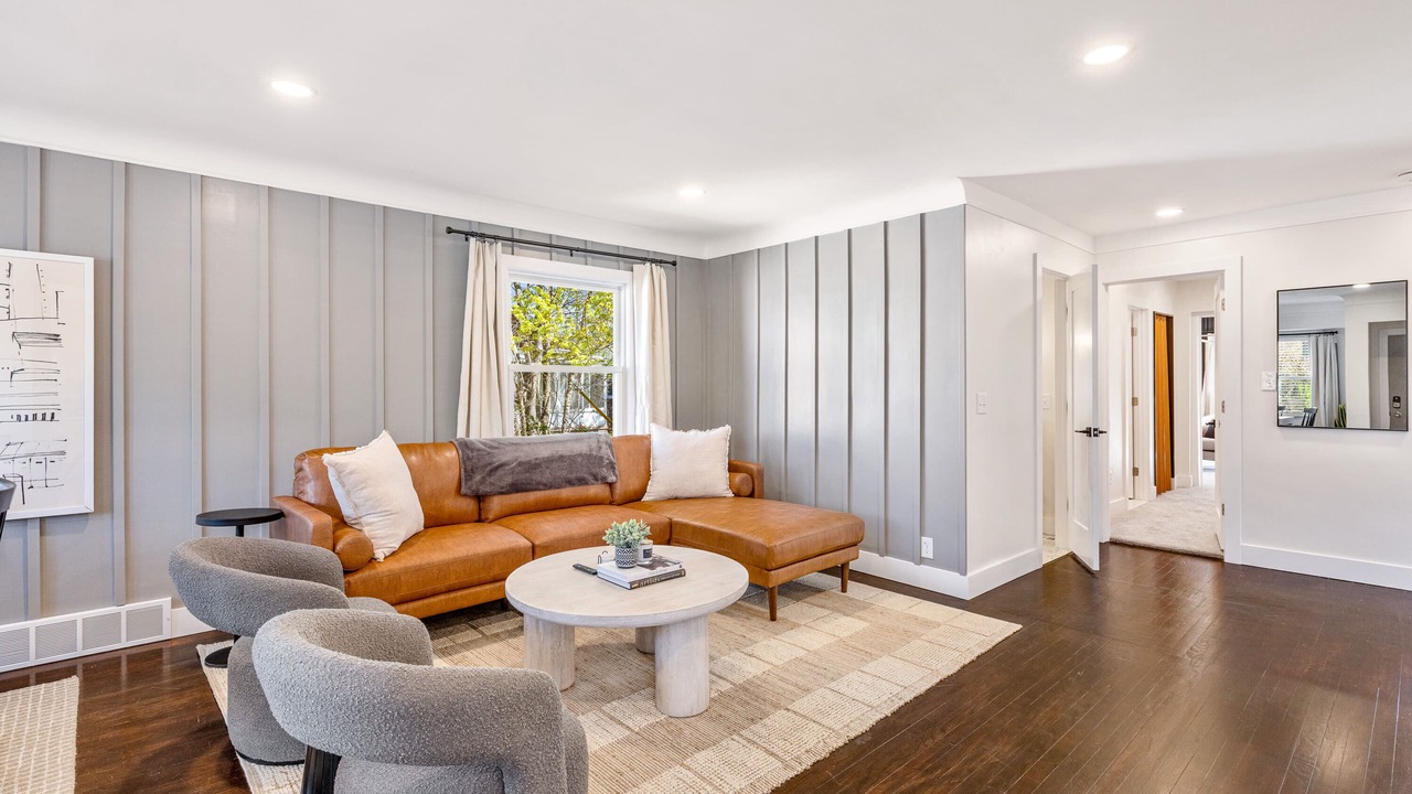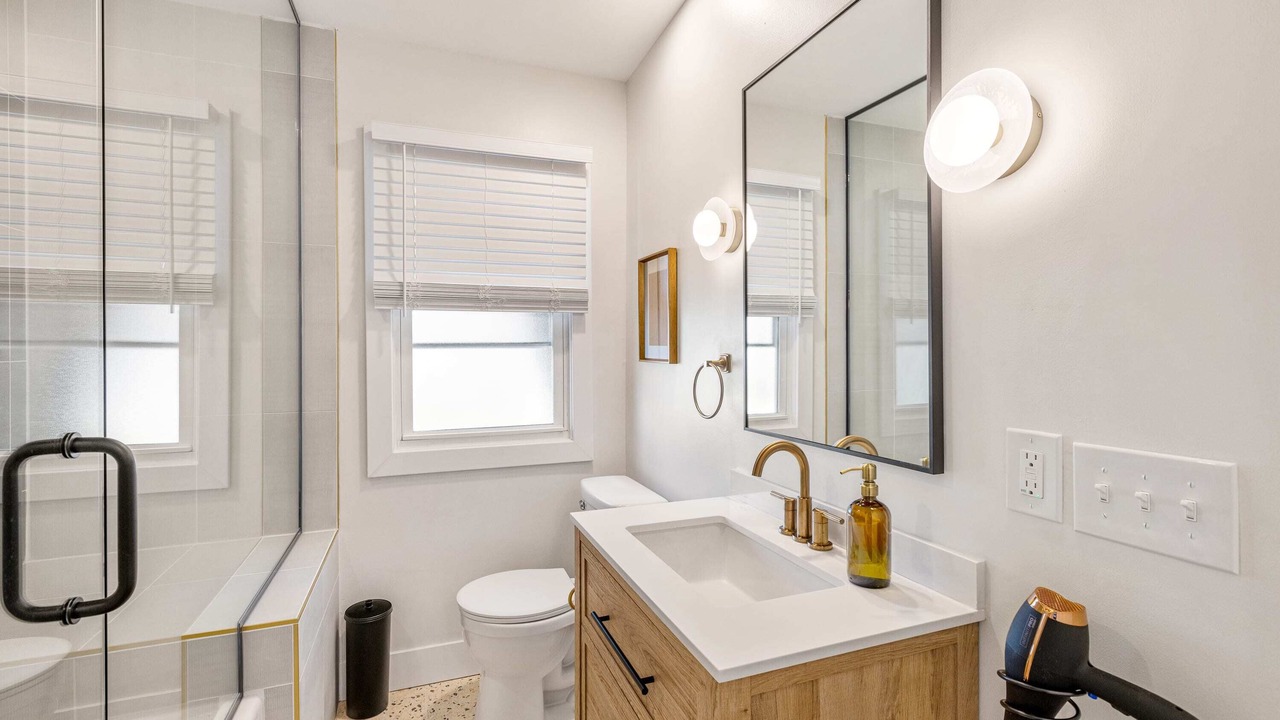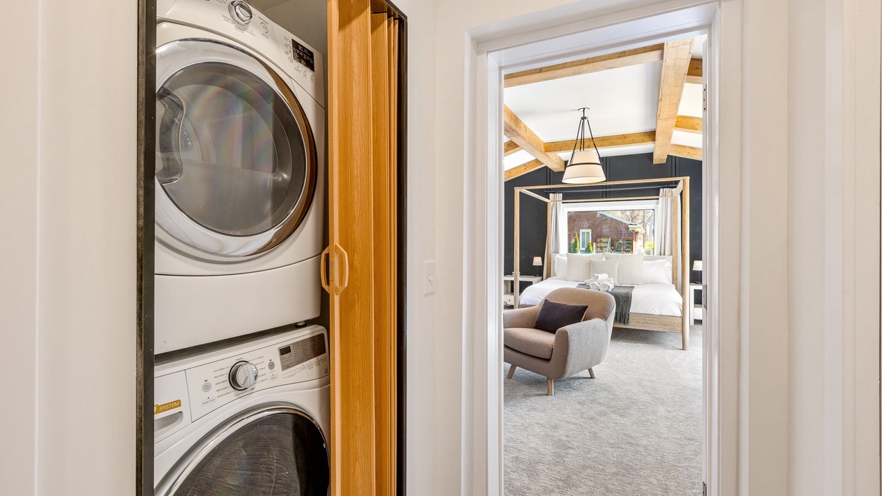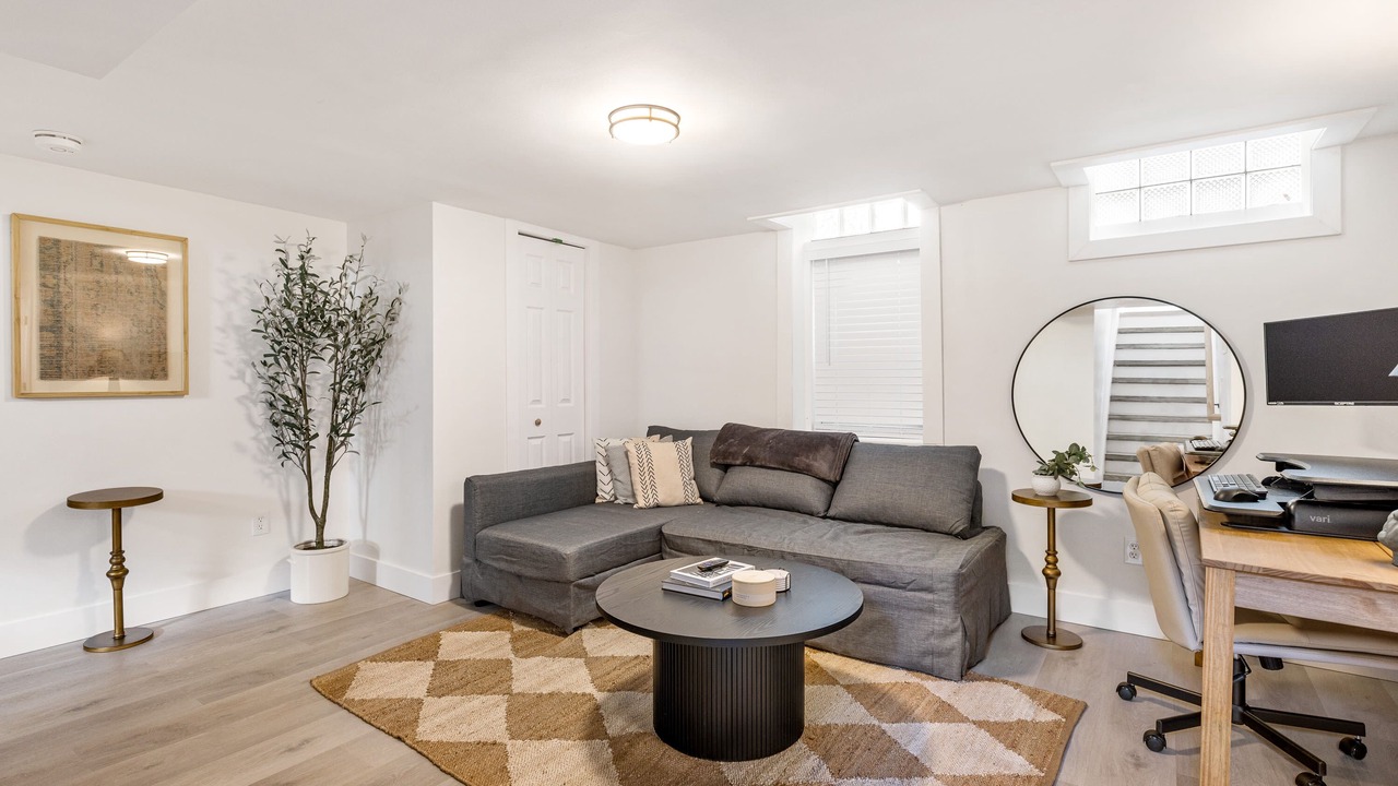 The main level of the home includes three bedrooms and two bathrooms plus a full set of laundry machines (stacked) along with the kitchen, dining room, and living room. Among those three bedrooms is the primary suite which features its own full bathroom, set of laundry machines, and closet. The suite can be closed off via a door to the main floor living room. The basement, down one full flight of stairs, features the workspace area with a standing desk setup, a separate entertaining / TV area, the pullout couch, another two bedrooms and another full bathroom, and the laundry room.