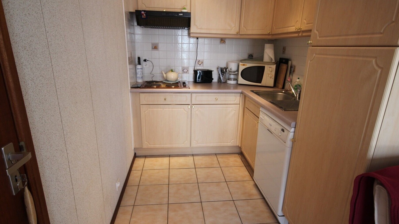 Fully-equipped kitchen: mini-oven, microwave, built-in fridge, 4 hotplates, electric coffee maker, kettle.