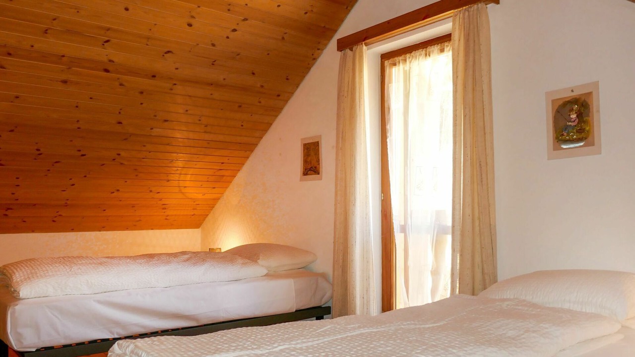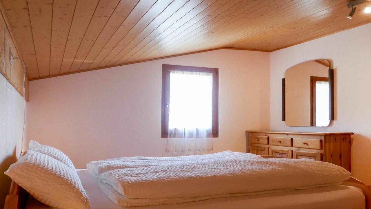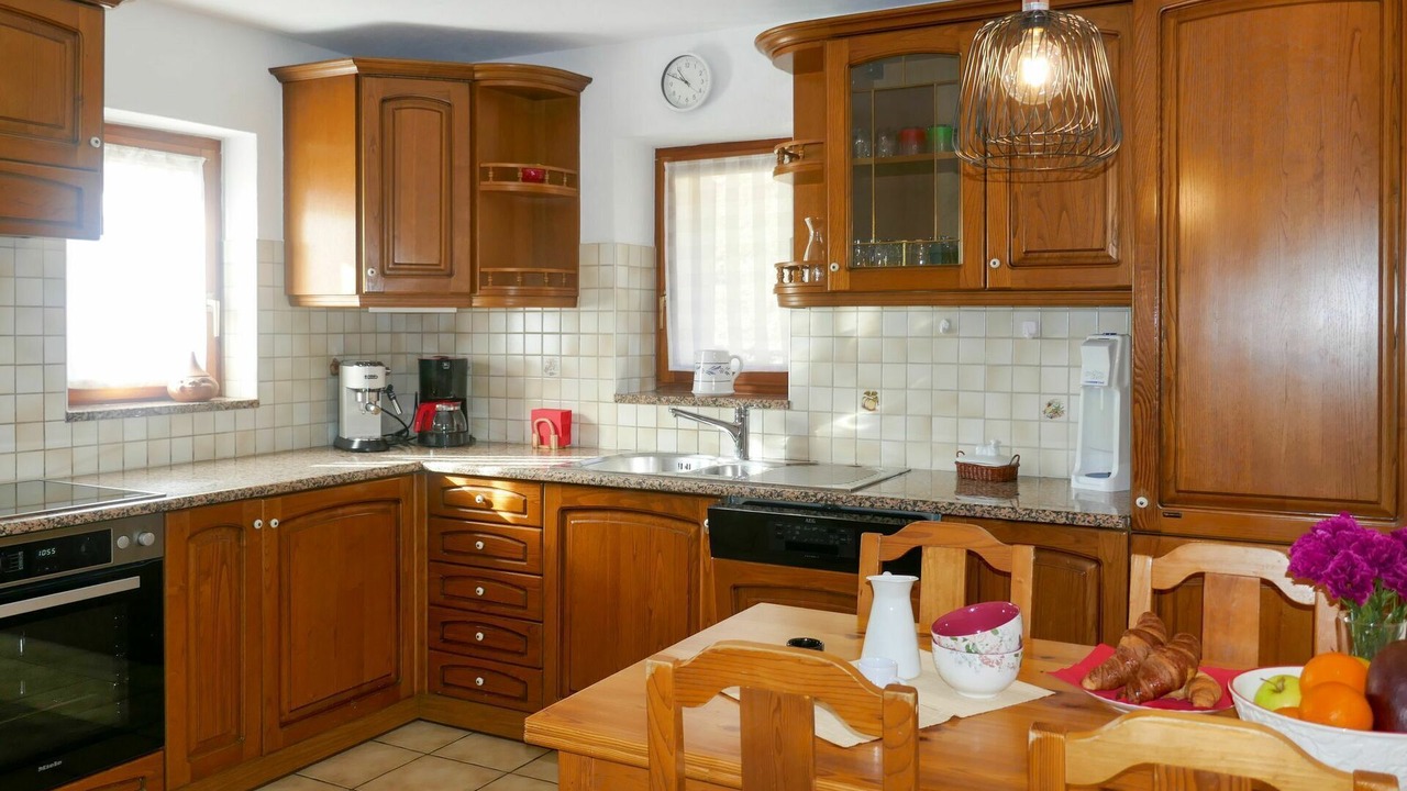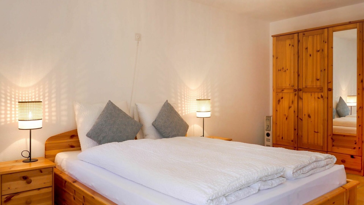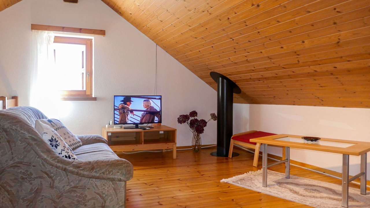 You can look forward to a spacious 4-room house with 120 square meters of living space, featuring a combination of open areas and cozy nooks. The main living and dining room are combined into one inviting space, complete with a dining nook, TV, and a wood-burning stove for added ambiance. One bedroom is equipped with a double bed measuring 160 cm wide and 200 cm long. The open kitchen is well-appointed with an oven, dishwasher, four ceramic glass hob hotplates, toaster, kettle, freezer, electric coffee machine, raclette grill, and a fondue set for enjoying traditional cheese fondue. A separate shower room and toilet are also included on the main level. Downstairs, you'll find another bedroom with a double bed of the same size, along with a bathroom with a bathtub and toilet, providing direct access to the garden. Upstairs, there is an open living room with sloping ceilings and a TV, as well as another bedroom with sloping ceilings and two single beds measuring 90 cm wide and 200 cm long.